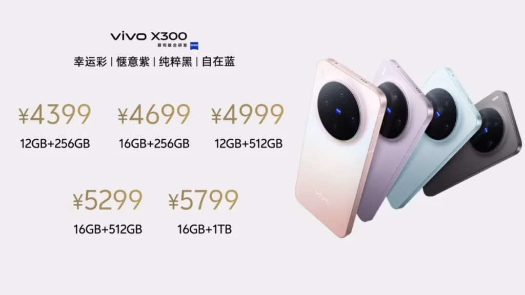 Vivo X300 starts at CNY 4,399 (~$620) for 12GB/256GB, with higher-end options going up to CNY 5,999 (~$845) for the 16GB/1TB model.