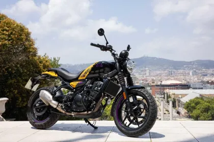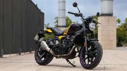 The Royal Enfield Guerrilla 450 is a versatile scrambler motorcycle capable of handling diverse terrain. It features a 452 cc displacement, liquid-cooled, 39.47 bhp engine. Key features include manual transmission, dual-channel ABS, petrol fuel, 2 seater.