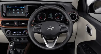 The Hyundai Aura is a compact sedan designed for comfortable commuting and long drives. It features 1197 cc displacement, 81.86 bhp @ 6000rpm power, 113.8 Nm @ 4000rpm torque engine. Key features include automatic (amt) transmission, petrol fuel 5 seater seating capacity