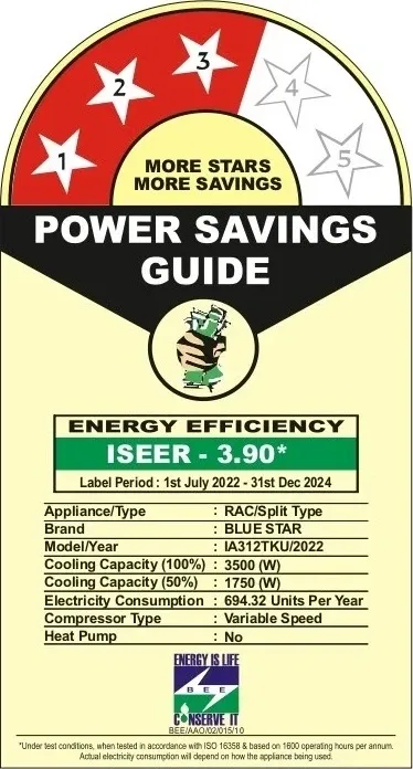 Specification: Blue Star IA312TKU 1 Ton 3 Star 2022 Inverter Split AC