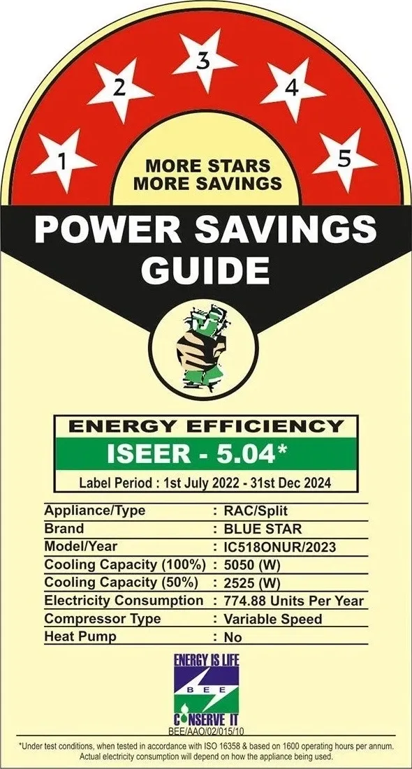 Specification: Blue Star IC518ONUR 1.5 Ton 5 Star 2023 Inverter Split AC