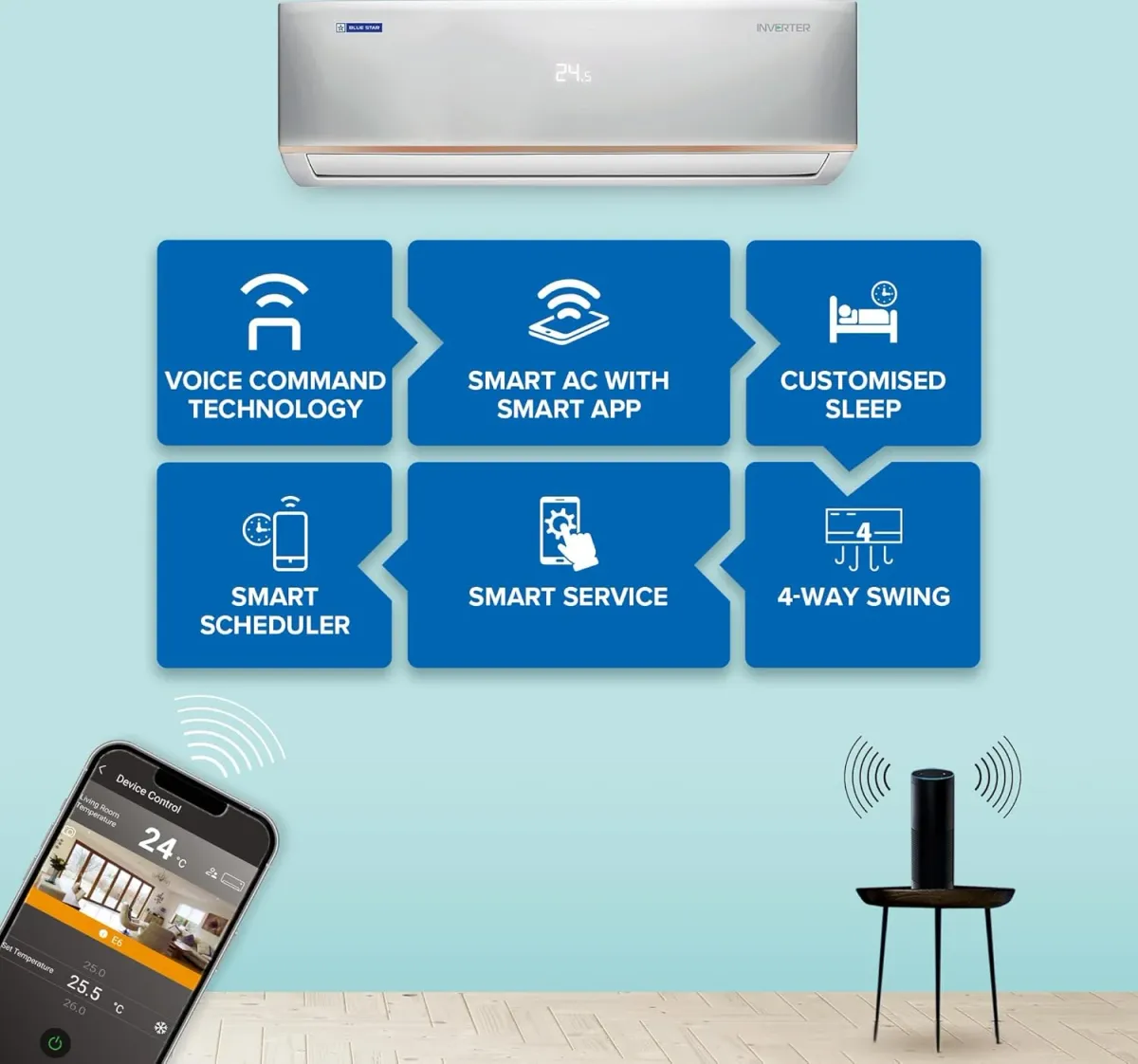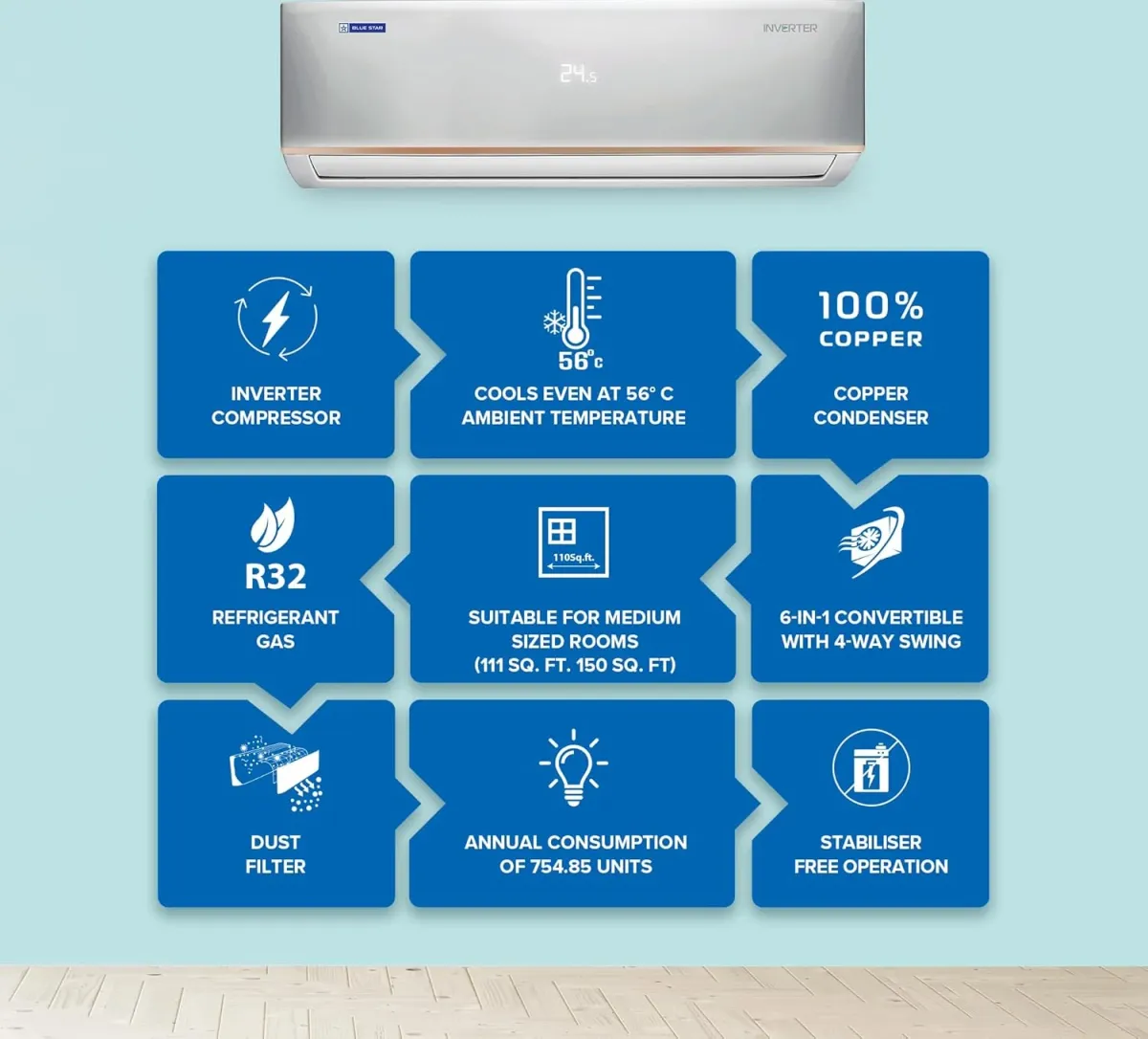 The Blue Star IC718DCUHD 1.5 Ton 5 Star 2024 Inverter Split AC is a Split AC. Capacity: 1.5 Ton. Energy rating: 5 star. Brand: Blue Star.