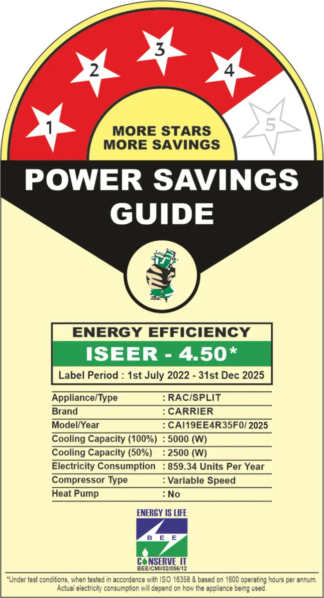 Specification: Carrier CAI19EE4R35F0 1.5 Ton 4 Star 2025 Inverter Split AC