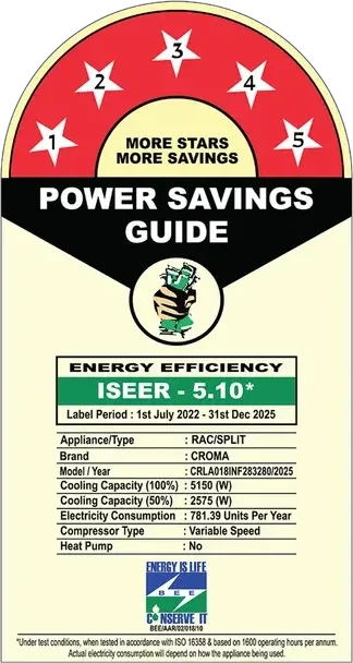 Specification: Croma CRLA018INF283280 1.5 Ton 5 Star 2025 Inverter Split AC