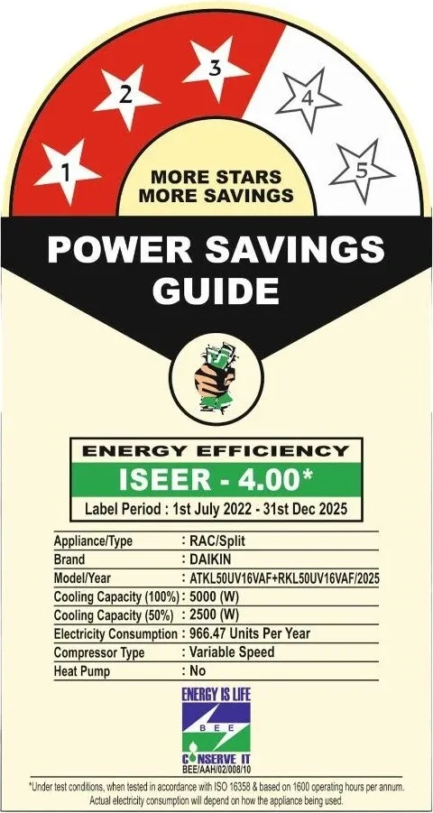 Specification: Daikin ATKL50UV16VAF 1.5 Ton 3 Star 2025 Inverter Split AC