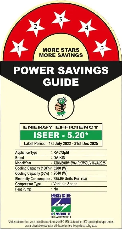 Specification: Daikin ATKM50UV16VA 1.5 Ton 5 Star 2025 Inverter Split AC