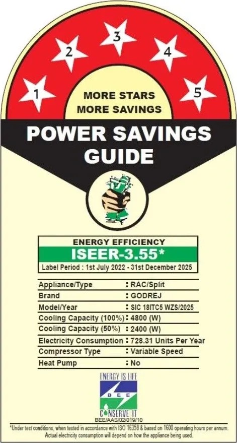 The Godrej SIC 18ITC5 WZS 1.5 Ton 5 Star 2025 Inverter Split AC is a Split AC. Capacity: 1.5 Ton. Energy rating: 5 star. Brand: Godrej.