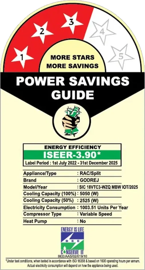 Specification: Godrej SIC 18VTC3 WZQ MBW 1.5 Ton 3 Star 2025 Inverter Split AC