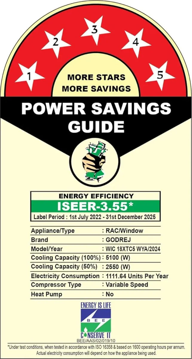 Specification: Godrej WIC 18XTC5 WYA 1.5 Ton 5 Star 2025 Inverter Window AC