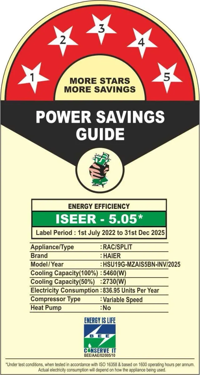 Specification: Haier HSU19G-MZAIS5BN-INV 1.6 Ton 5 Star 2025 Inverter Split AC