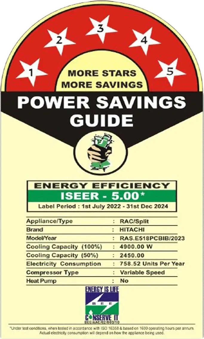 Specification: Hitachi RAS.E518PCBIB 1.5 Ton 5 Star 2023 Inverter Split AC