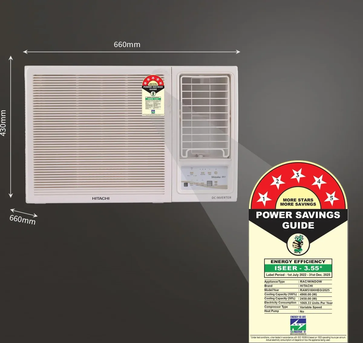 Specification: Hitachi RAW518HHEO 1.5 Ton 5 Star 2025 Inverter Window AC