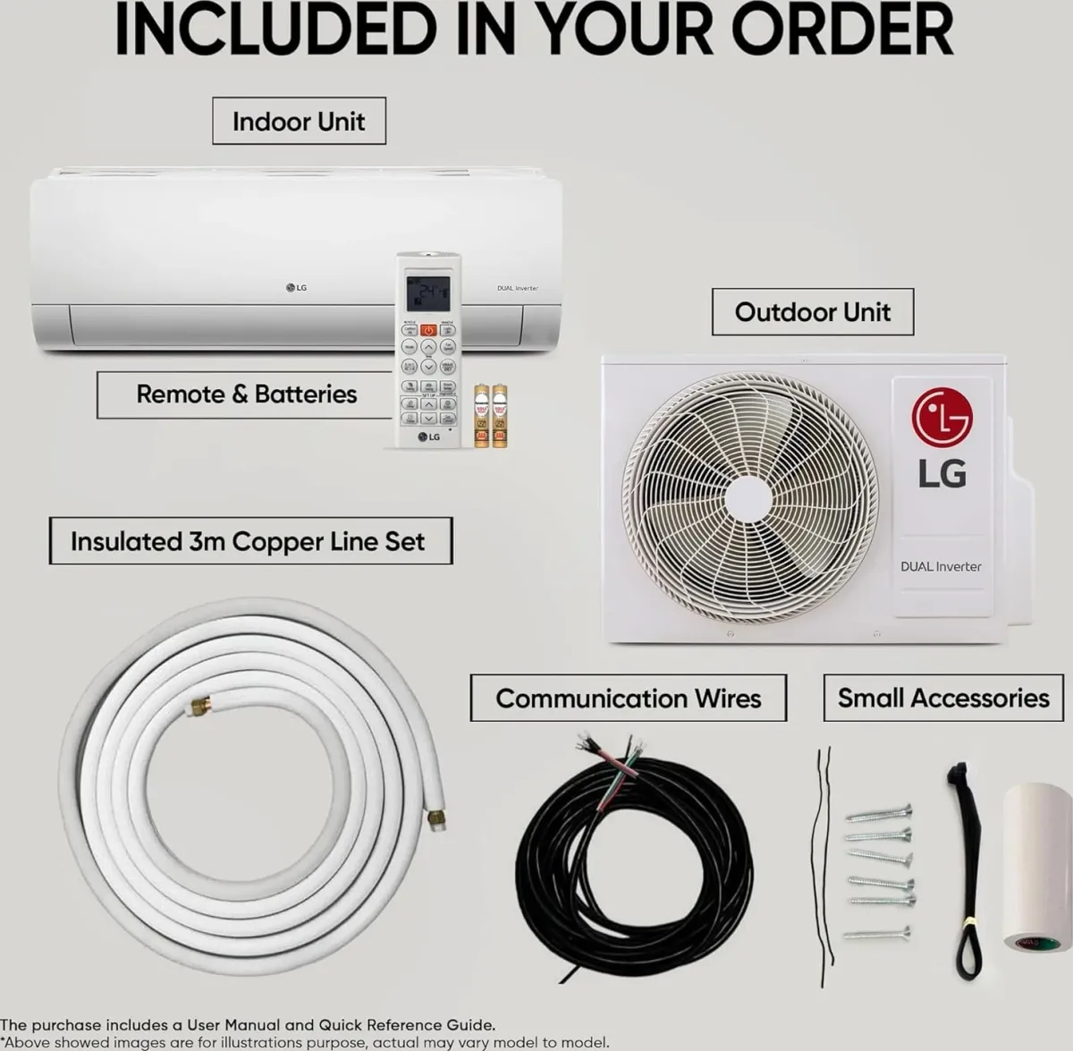 1 Indoor Unit, 1 Outdoor Unit, 3 m Length Inter Connecting Copper Pipe, 1 Remote, 1 Manual, 1 Warranty Card