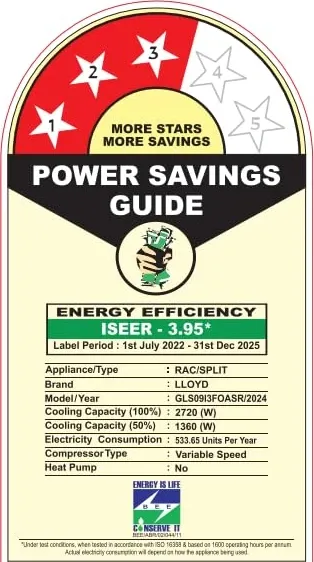 Specification: Lloyd GLS09I3FOASR 0.8 Ton 3 Star Inverter Split AC