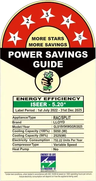 The Lloyd GLS18V5KWGGR 1.5 Ton 5 Star 2025 Inverter Split AC is a Split AC. Capacity: 1.5 Ton. Energy rating: 5 star. Brand: Lloyd.