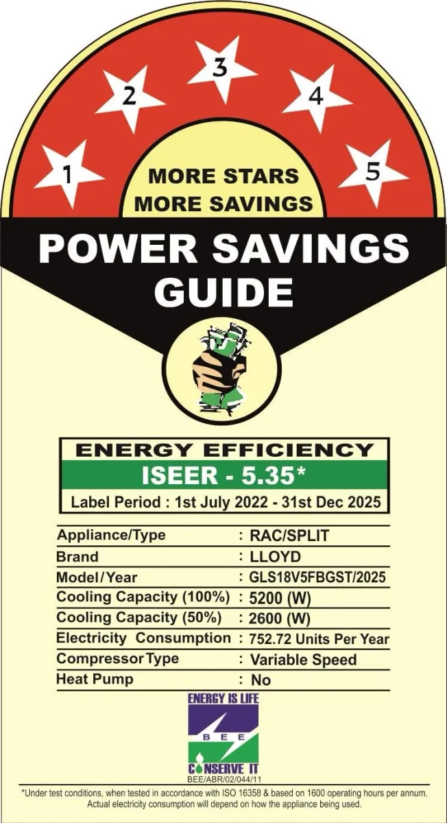 Specification: Lloyd Stellar Art GLS18V5FBGST 1.5 Ton 5 Star 2025 Inverter Split AC