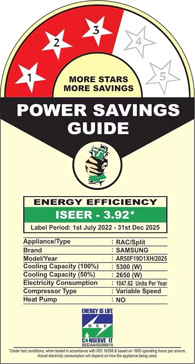 Specification: Samsung AR50F19D1XH 1.5 Ton 3 Star 2025 Inverter Split AC