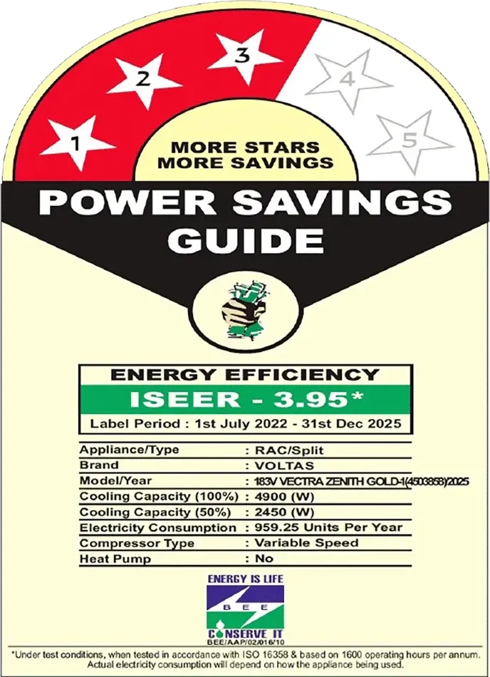 Specification: Voltas Vectra Zenith Gold-1 1.5 Ton 3 Star 2025 Inverter Split AC