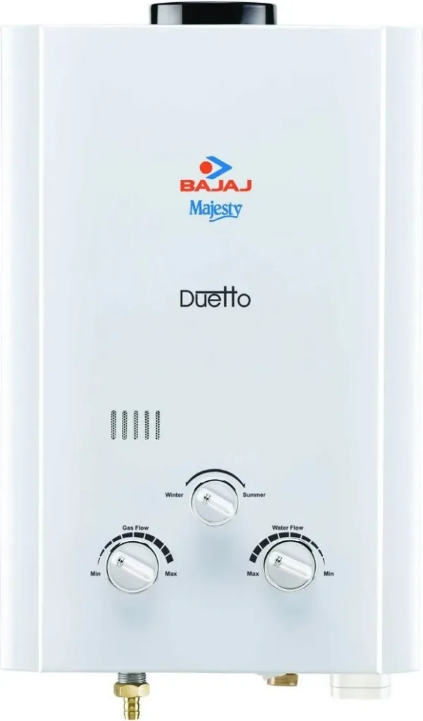 The Bajaj Majesty Duetto 6L Gas Water Heater is a Gas. Capacity: 6 L. Brand: Bajaj.