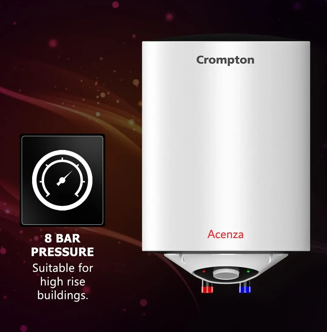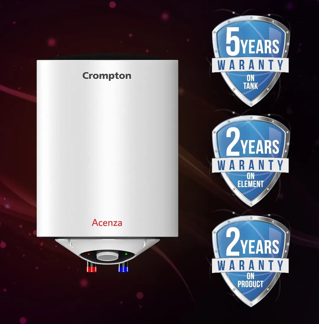 The Crompton Acenza 15L Storage Water Geyser is a Storage water geyser. Capacity: 15 L. Energy rating: 3 star. Brand: Crompton.