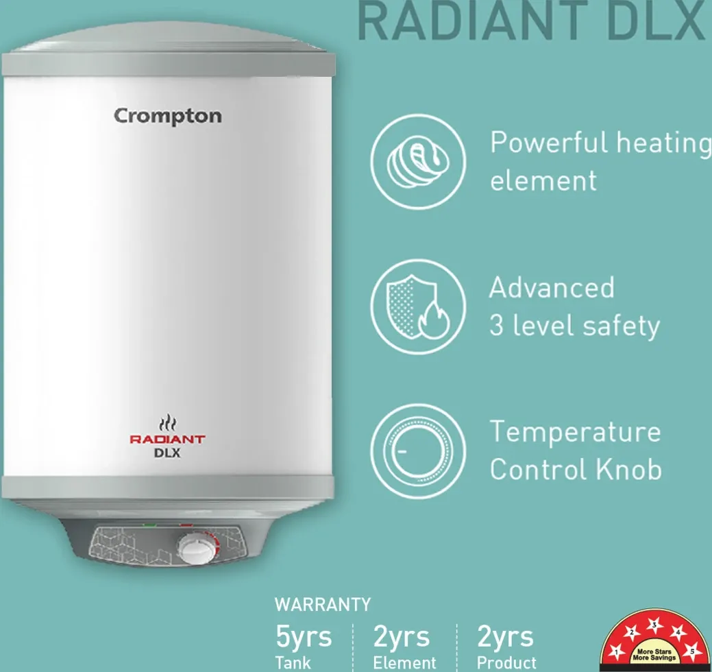 The Crompton Radiant Dlx 35L Storage Water Geyser is a Storage water geyser. Capacity: 35 L. Energy rating: 5 star. Brand: Crompton.