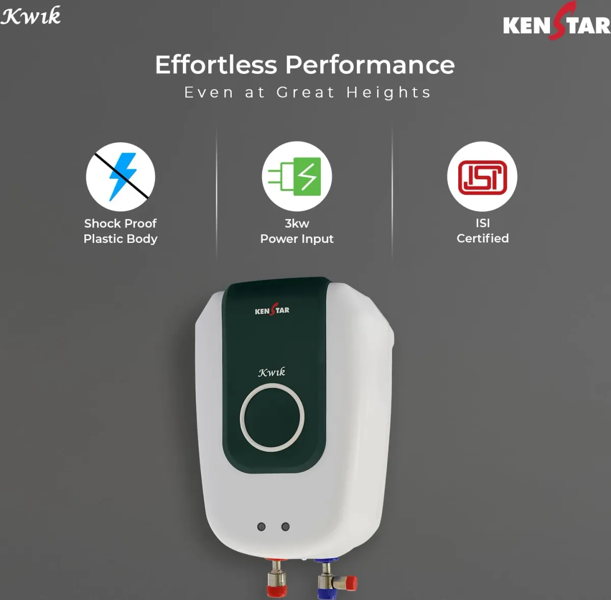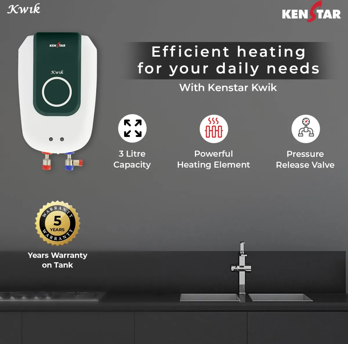 The Kenstar Kwik 3L Instant Water Geyser is a Instant water geyser. Capacity: 3 L. Brand: Kenstar.