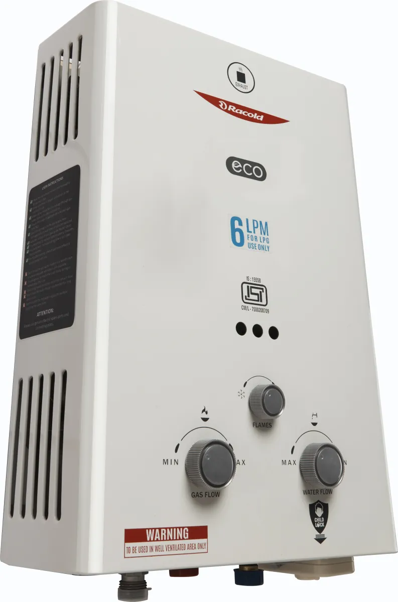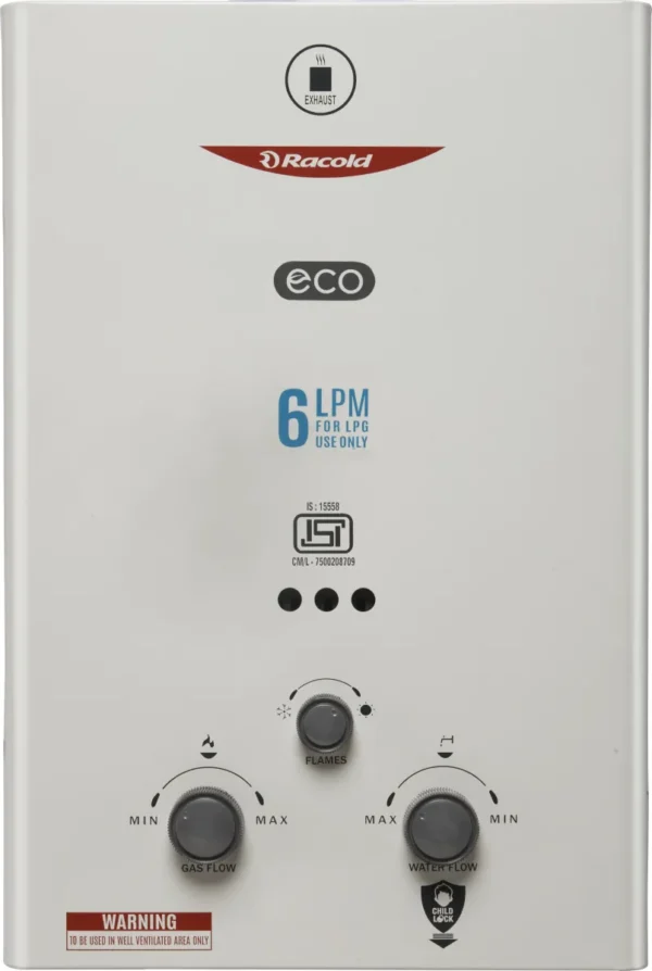 The Racold ECO LPG Gas 6L Water Geyser is a Gas. Capacity: 6 L. Brand: Racold.