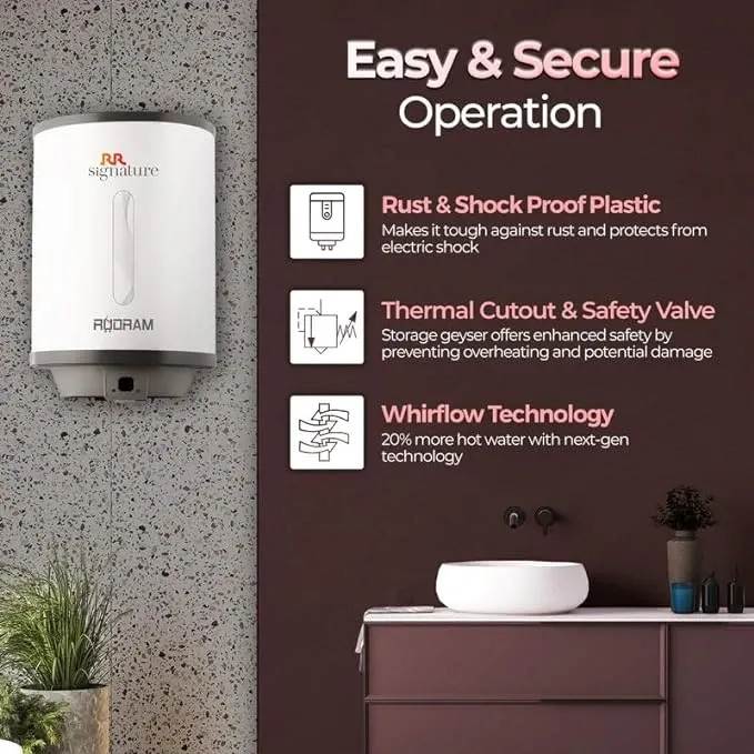 The RR Signature Rudram 25L Storage Water Geyser is a Storage water geyser. Capacity: 25 L. Brand: RR Signature.