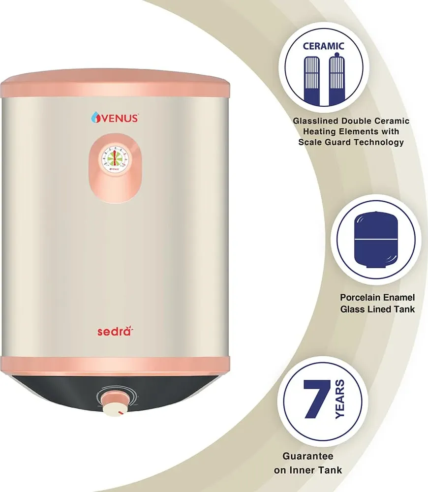 The Venus Sedra 15L Storage Water Geyser is a Storage water geyser. Capacity: 15 L. Energy rating: 5 star. Brand: Venus.