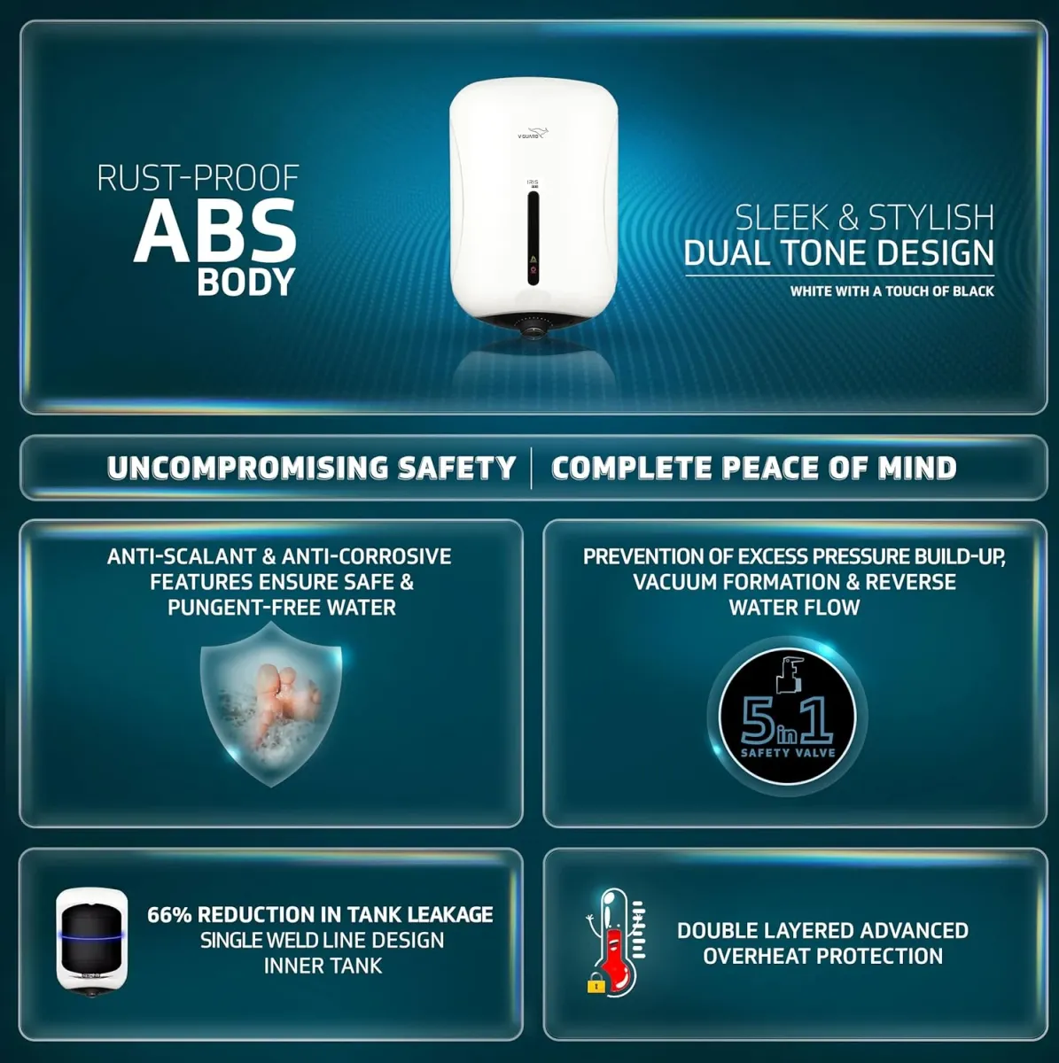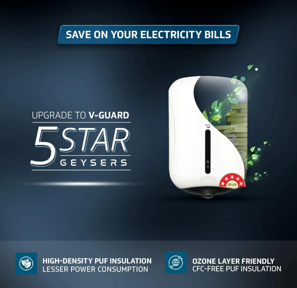 The V-Guard Iris Pro 10 L Storage Water Geyser is a Storage water geyser. Capacity: 10 L. Energy rating: 5 star. Brand: V-Guard.