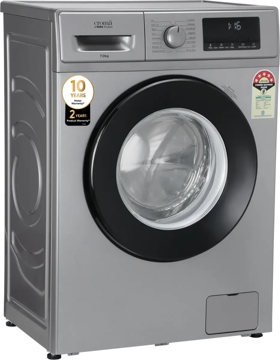 The Croma CRLW070FLF316254 7 kg Fully Automatic Front Load Washing Machine is a Washing Machine with Dryer. Capacity: 7 kg. Energy rating: 5 star. Brand: Croma.
