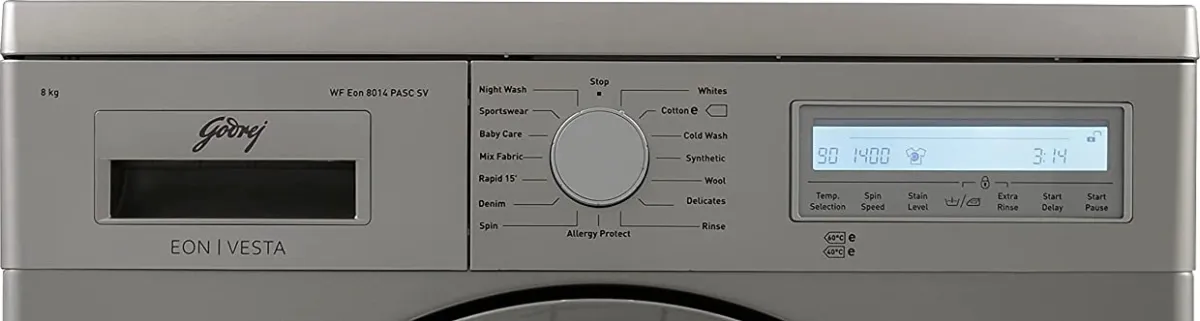 The Godrej WF EON 8014 PASC SV 8 Kg Fully Automatic Front Load Washing Machine is a Washing Machine with Dryer. Capacity: 8 kg. Brand: Godrej.