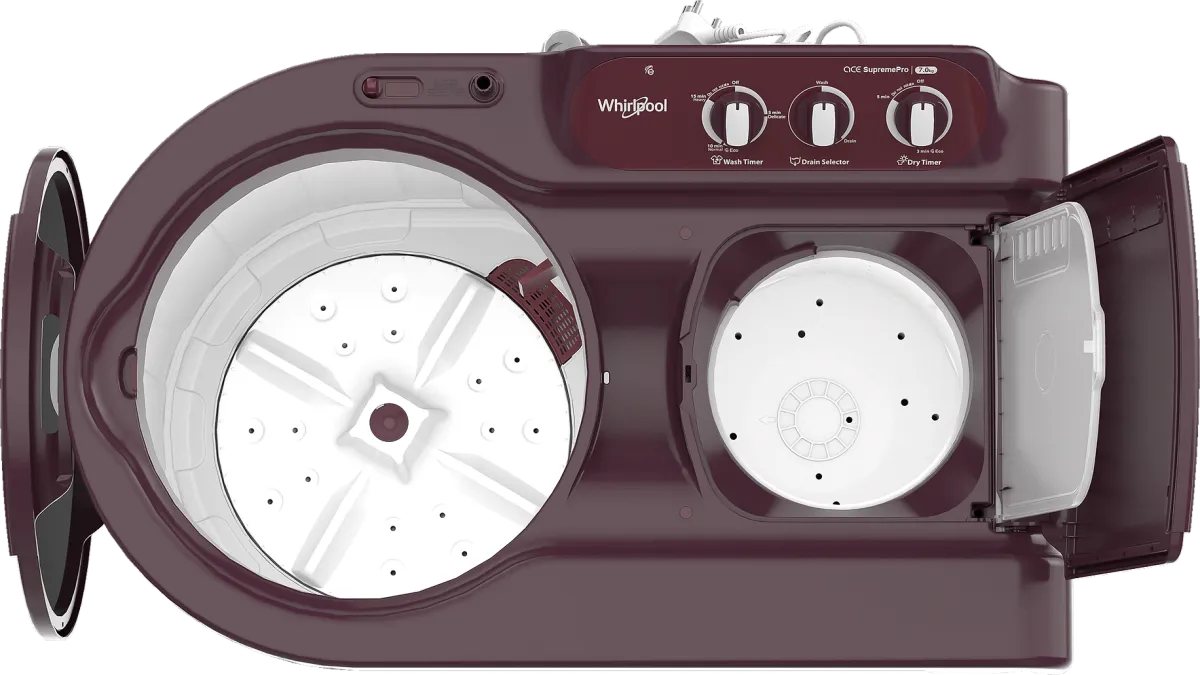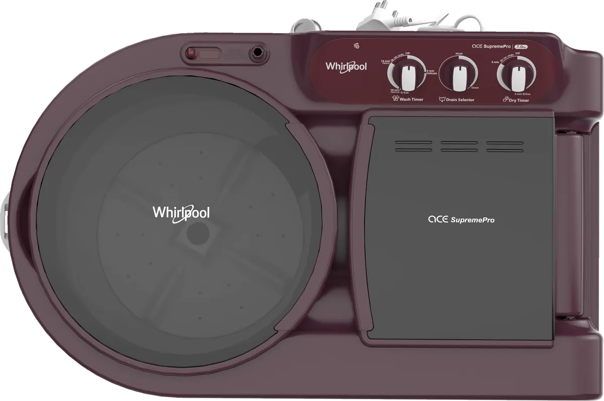 The Whirlpool Ace 7.0 Supreme Pro 7 kg Semi Automatic Washing Machine is a Washing Machine with Dryer. Capacity: 7 kg. Energy rating: 5 star. Brand: Whirlpool.