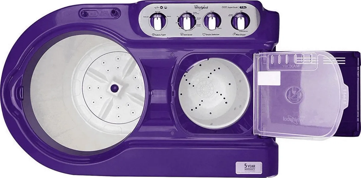 The Whirlpool Ace Super Soak 7.5 kg Semi Automatic Washing Machine is a Washing Machine with Dryer. Capacity: 7.5 kg. Energy rating: 5 star. Brand: Whirlpool.