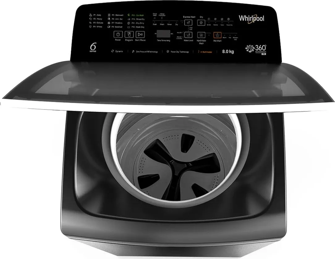 The Whirlpool Bloomwash Pro 360 8 Kg Fully Automatic Top Loading Washing Machine is a Washing Machine with Dryer. Capacity: 8 kg. Energy rating: 5 star. Brand: Whirlpool.