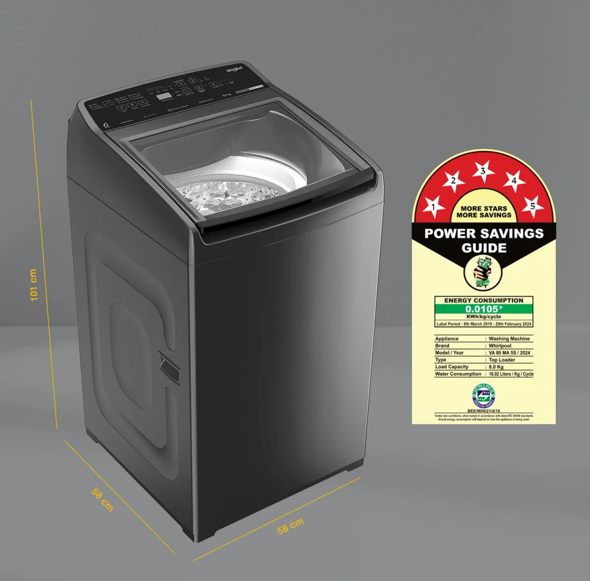 The Whirlpool Magic Clean Pro SW H 8 Kg Fully Automatic Top Load Washing Machine is a Washing Machine with Dryer. Capacity: 8 kg. Energy rating: 5 star. Brand: Whirlpool.