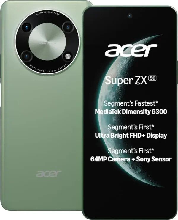 The Acer Super ZX 5G is a Smartphone. Brand: Acer. RAM: 6 GB. Storage: 128 GB. Battery: 5000 mAh, Li-ion Battery. OS: Android v15.