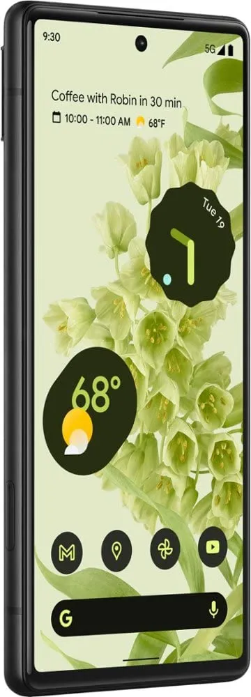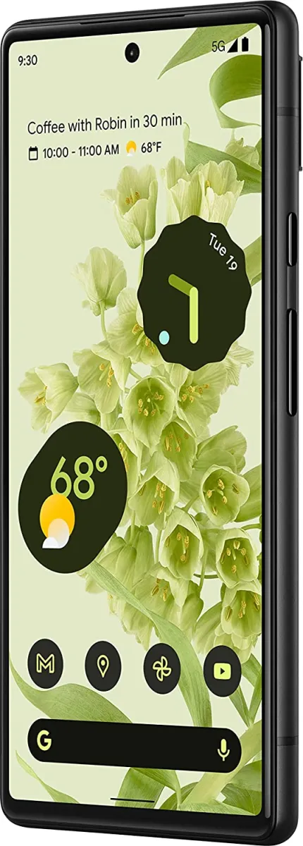 The Google Pixel 6 is a Smartphone. Brand: Google. RAM: 8 GB. Storage: 128 GB. Battery: 4614 mAh, Li-Po Battery. OS: Android v12.