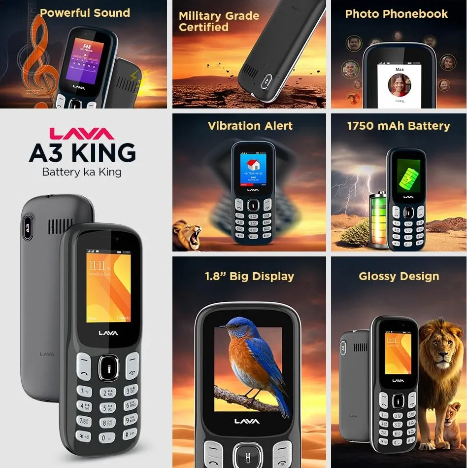 The Lava A3 King is a Smartphone. Brand: Lava. RAM: 4 MB. Storage: 3 MB. Battery: 1750 mAh, Li-ion Battery.