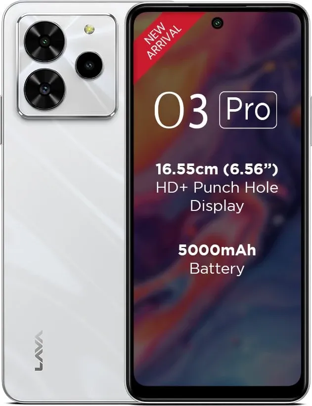 The Lava O3 Pro is a Smartphone. Brand: Lava. RAM: 4 GB. Storage: 128 GB. Battery: 5000 mAh, Li-Po Battery. OS: Android v14.
