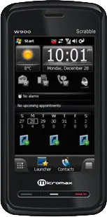The Micromax W900 is a Smartphone. Brand: Micromax. RAM: 128 MB. Storage: 256 MB. Battery: 1500 mAh, Li-ion Battery. OS: Windows Mobile v6.1.
