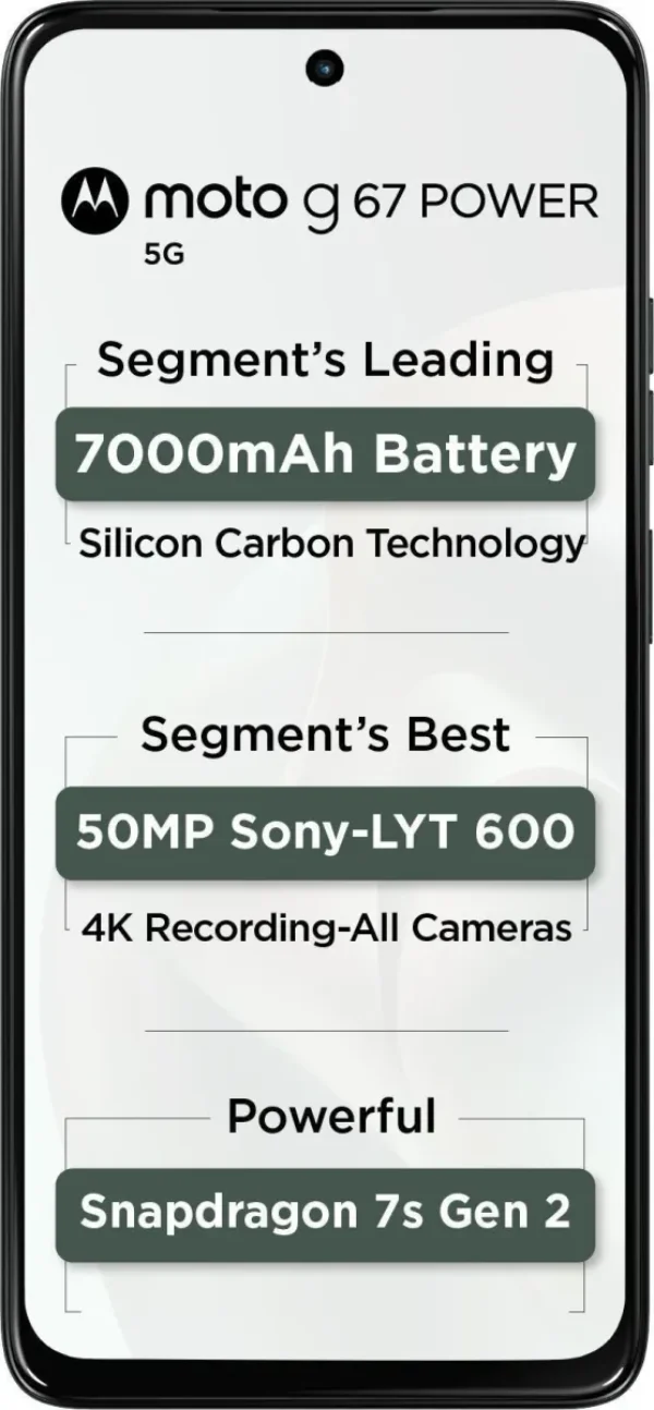 The Motorola Moto G67 Power 5G is a Smartphone. Brand: Motorola. RAM: 8 GB. Storage: 128 GB. Battery: 7000 mAh, Si/C. OS: Android v15, upgradable to v16.