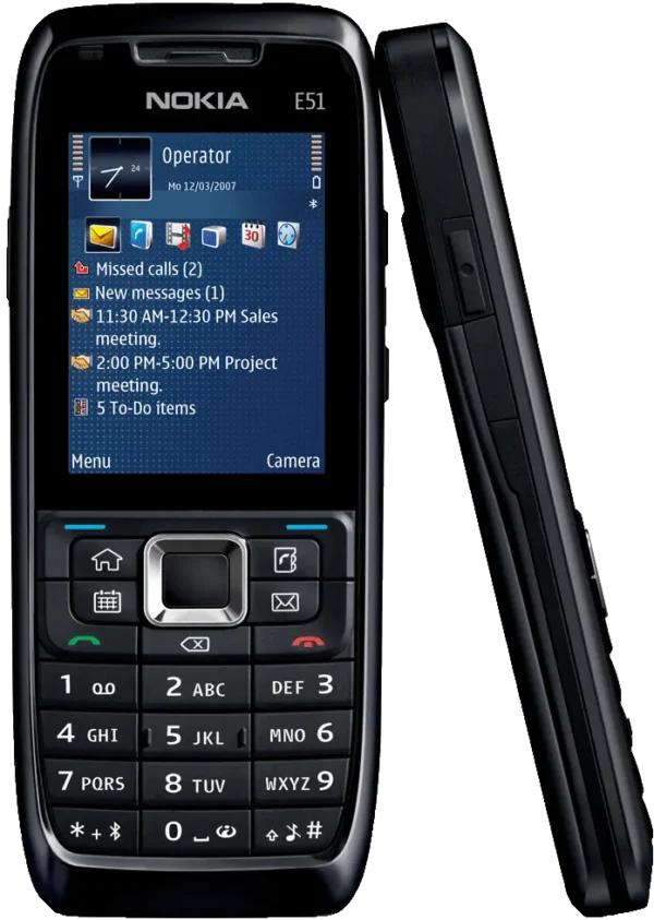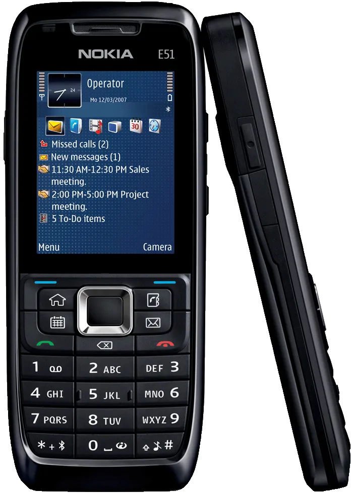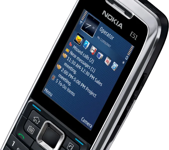 The Nokia E51 is a Smartphone. Brand: Nokia. RAM: 96 MB. Storage: 130 MB. Battery: 1050 mAh, Li-ion Battery. OS: Symbian v9.2.