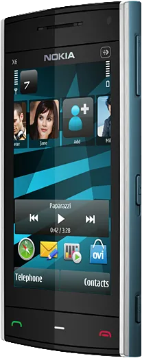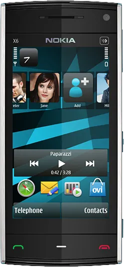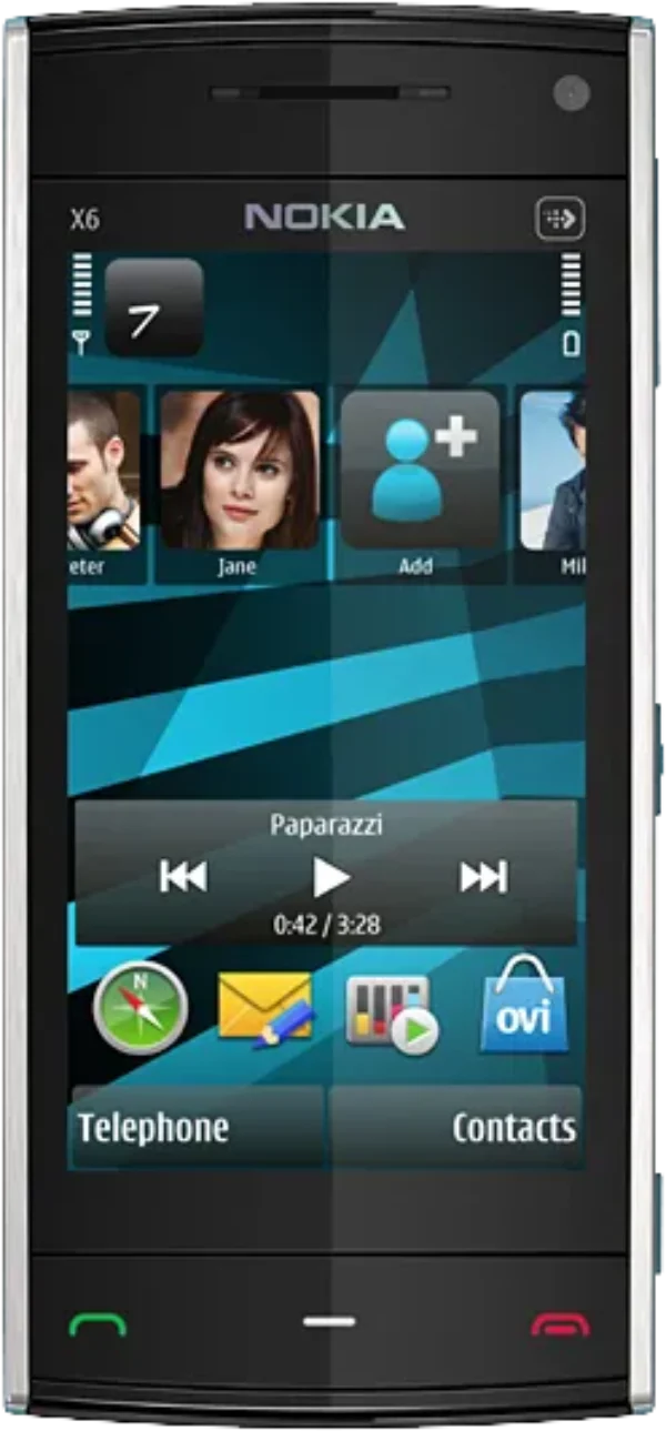 The Nokia X6 16GB is a Smartphone. Brand: Nokia. RAM: 128 MB. Storage: 16 GB. Battery: 1320 mAh, Li-ion Battery. OS: Symbian v9.4.