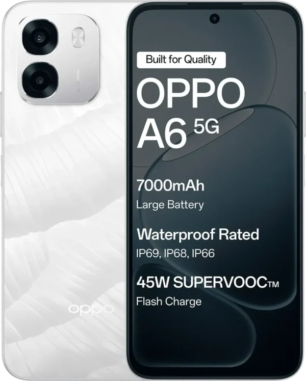 The Oppo A6 5G is a Smartphone. Brand: Oppo. RAM: 4 GB. Storage: 128 GB. Battery: 7000 mAh. OS: Android v15.