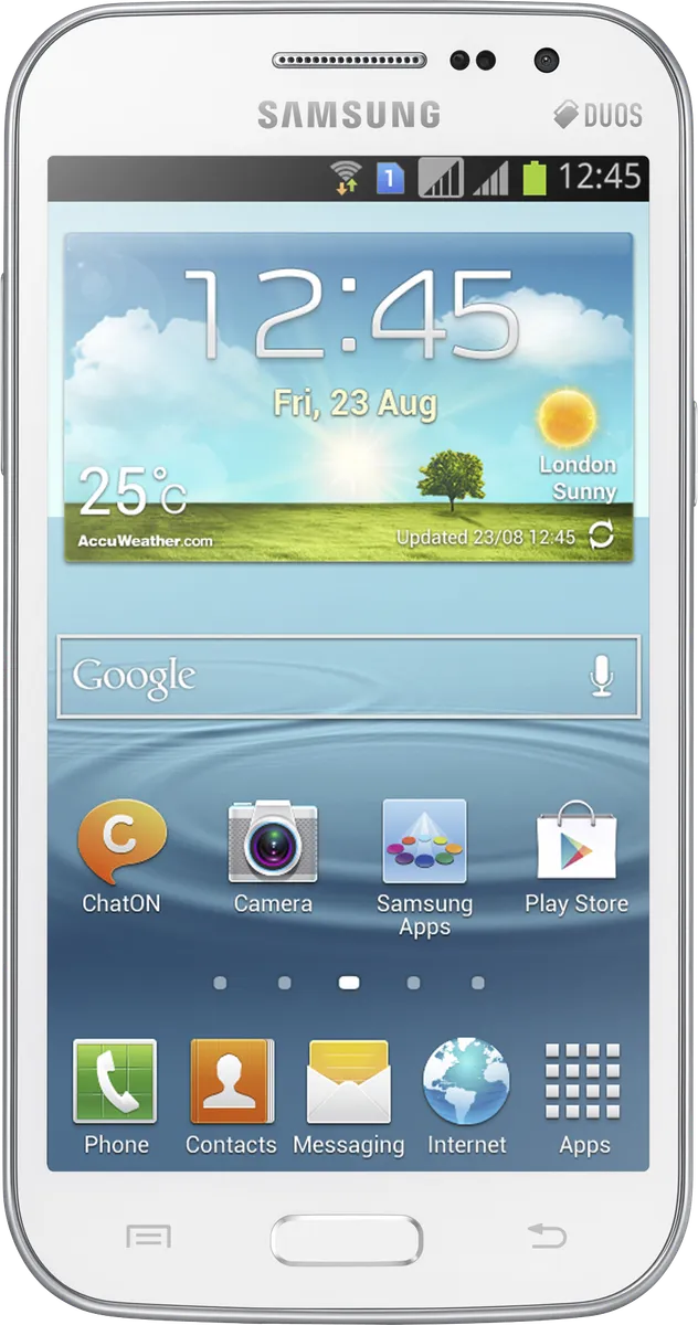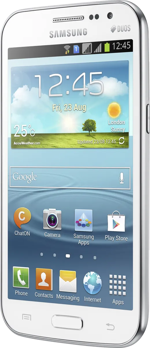 The Samsung Galaxy Grand Quattro (Win Duos) I8552 is a Smartphone. Brand: Samsung. RAM: 1 GB. Storage: 8 GB. Battery: 2000 mAh, Li-ion Battery. OS: Android v4.1.2 (Jelly Bean).