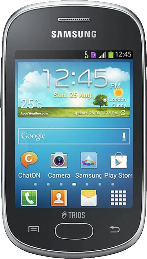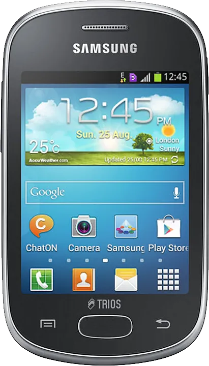 The Samsung Galaxy Star Trios S5283 is a Smartphone. Brand: Samsung. RAM: 512 MB. Storage: 4 GB. Battery: 1300 mAh, Li-ion Battery. OS: Android v4.1.2 (Jelly Bean).