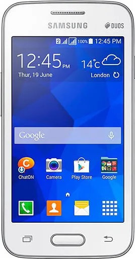 The Samsung Galaxy V Plus is a Smartphone. Brand: Samsung. RAM: 512 MB. Storage: 4 GB. Battery: 1500 mAh, Li-ion Battery. OS: Android v4.4.2 (KitKat).