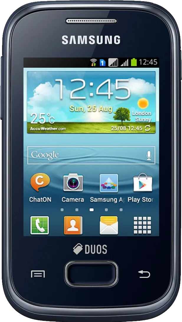 The Samsung Galaxy Y Plus S5303 is a Smartphone. Brand: Samsung. RAM: 512 MB. Storage: 4 GB. Battery: 1200 mAh, Li-ion Battery. OS: Android v4.0 (ICS).
