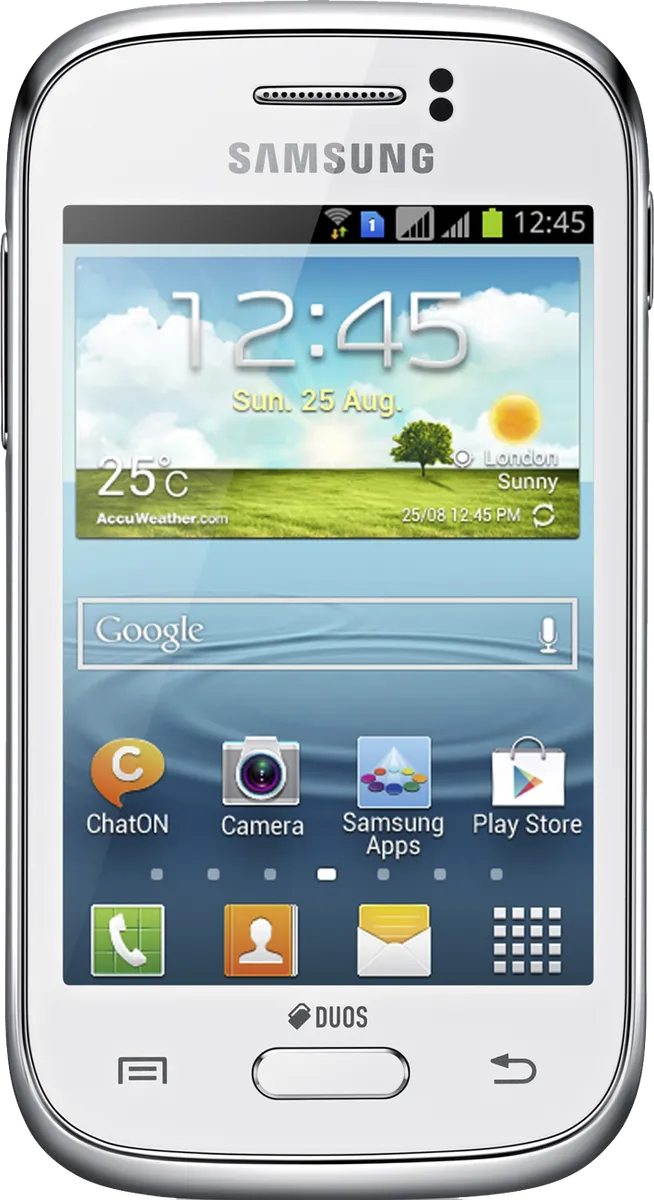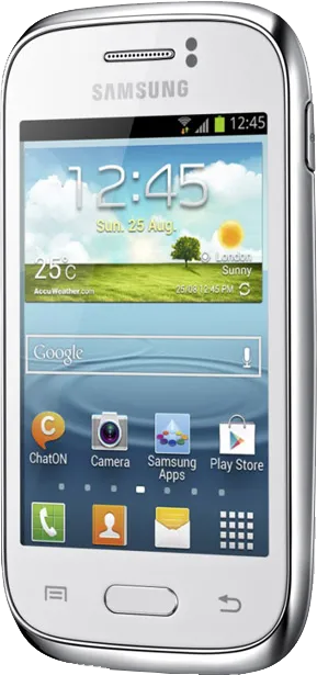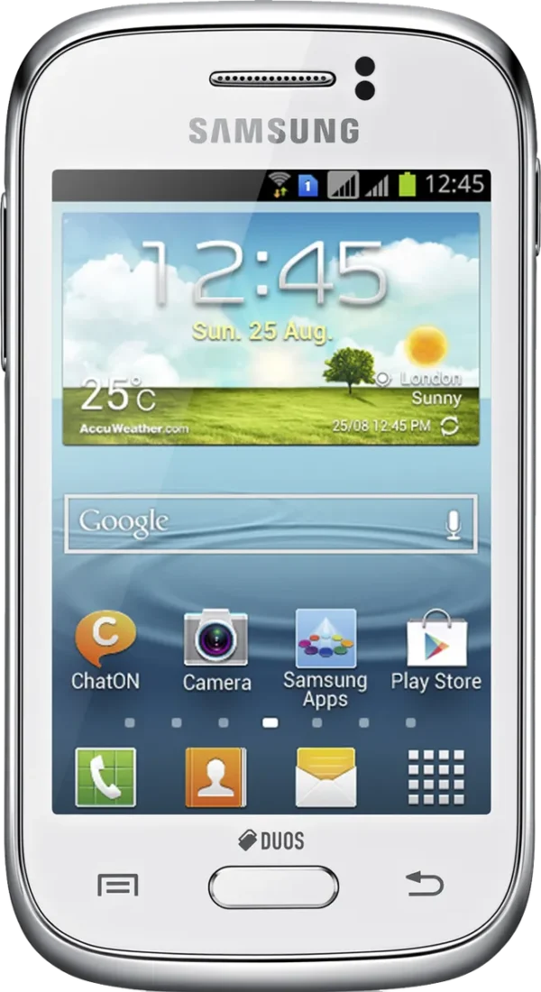 The Samsung Galaxy Young Duos S6312 is a Smartphone. Brand: Samsung. RAM: 768 MB. Storage: 4 GB. Battery: 1300 mAh, Li-ion Battery. OS: Android v4.1.2 (Jelly Bean).